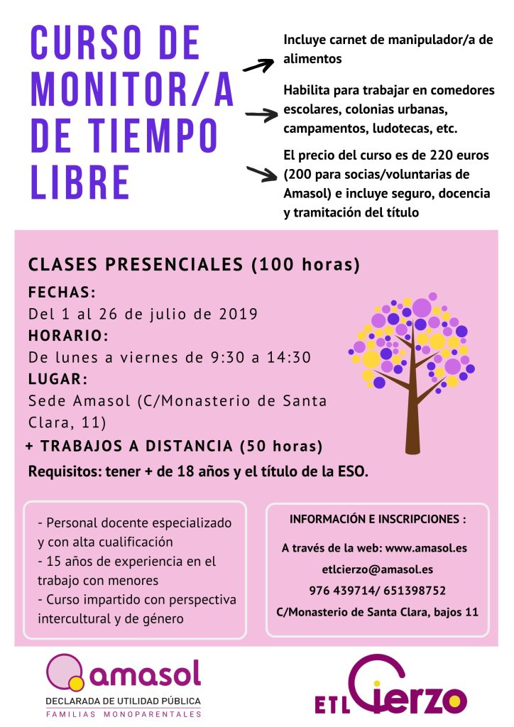 CURSO DE MONITOR/A DE TIEMPO LIBRE 1 al 26 de julio de 2019 (clases presenciales) 100h de formación presencial + 50h de formación a distancia + 160h de periodo de prácticas Requisitos: tener más de 18 años y titulación de ESO Precio del curso: 220€* (posibilidad de hacer pago fraccionado). Incluye docencia, seguro y tramitación […]