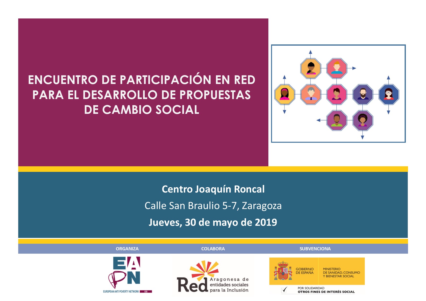 EAPN España (Red europea anti pobreza y exclusión social) y la Red Aragonesa de Entidades Sociales para la Inclusión organizan el jueves 30 de mayo en Zaragoza la sesión «Encuentro de Participación en RED para el desarrollo de propuestas de cambio social”